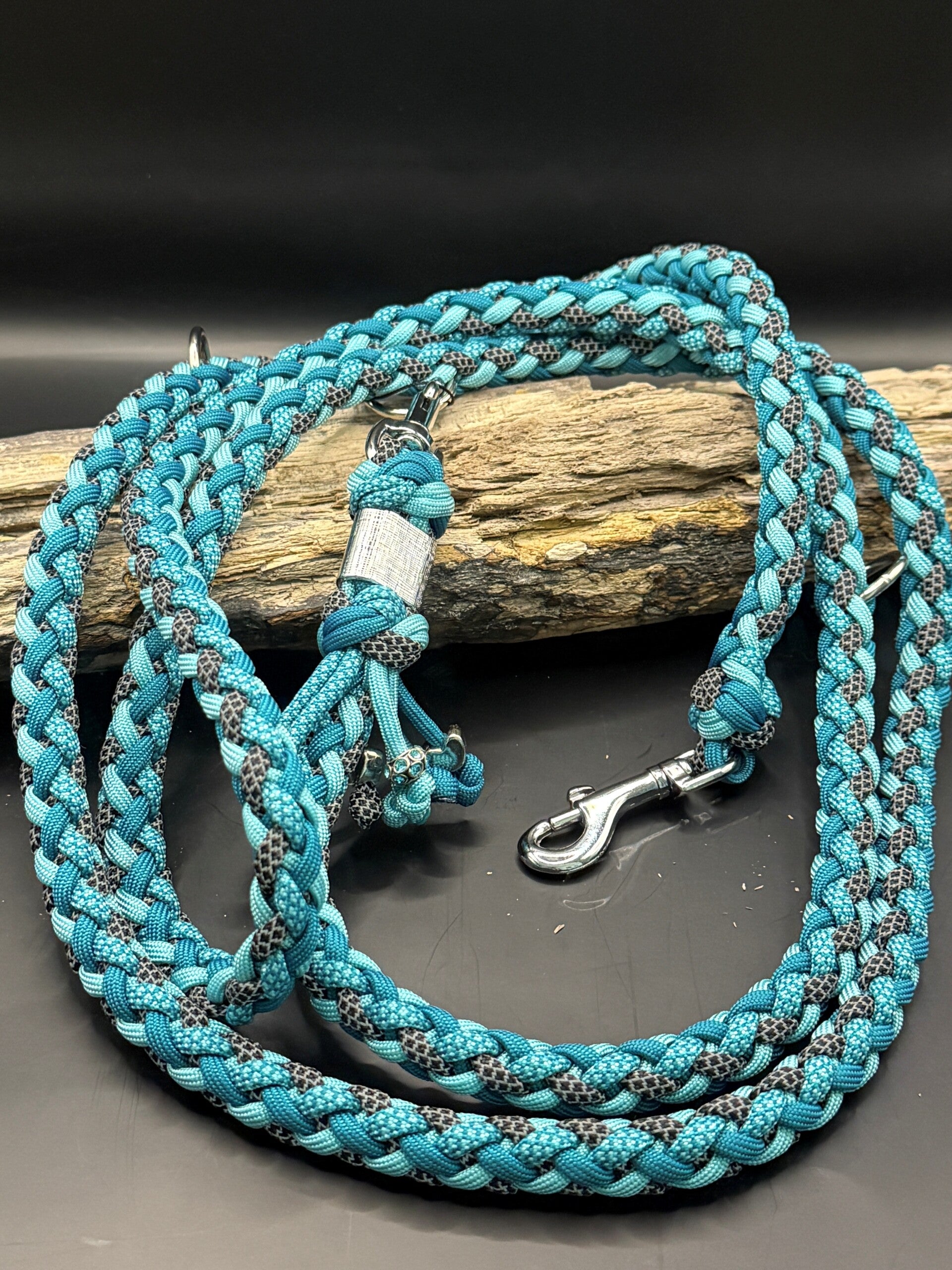 Paracordleine Knoten Gaucho 8-fach geflochten mit 2 Karabiner, 3-fach verstellbar, hoch reflektierend.
